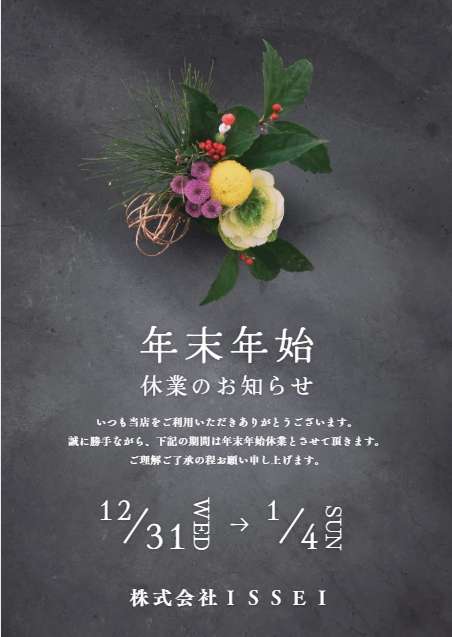 いつも株式会社ISSEI 各店舗をご利用いただき、誠にありがとうございます。 本年もたくさんのお客様、関係者の皆さまに支えられ、無事に一年を終えること……